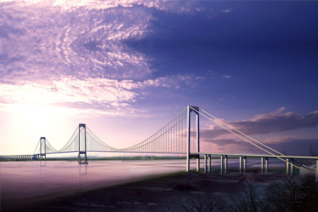 马普托大桥为地锚式悬索桥,主桥跨径680米,桥塔采用门式构造。...