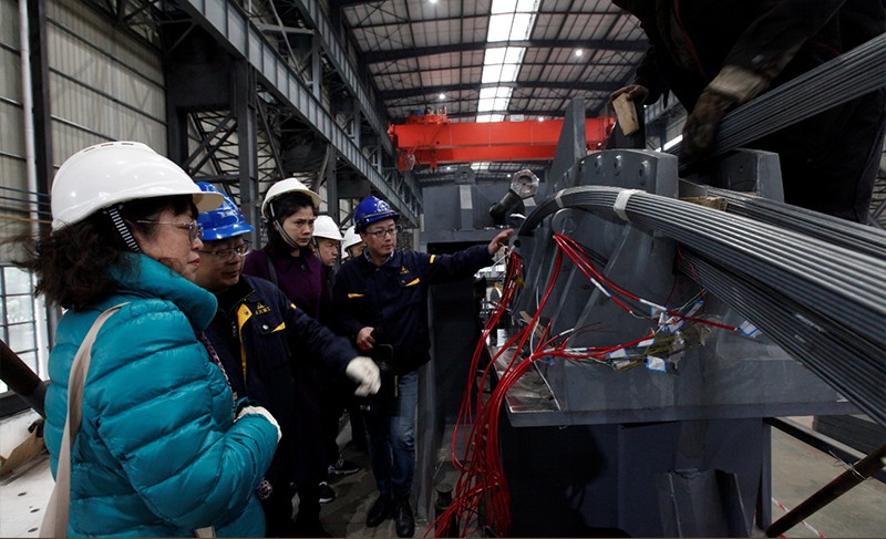 除索鞍索夹制造外,天元公司还承担了阳宝山特大桥锚固系统研发及供应、AS法的科研课题以及上部结构施工等任务。验收组领导一行检查了天元公司科研试验现场,并细致了解科研试验开展情况,对于科研课题的顺利开展,验收组领导给予了高度的评价。