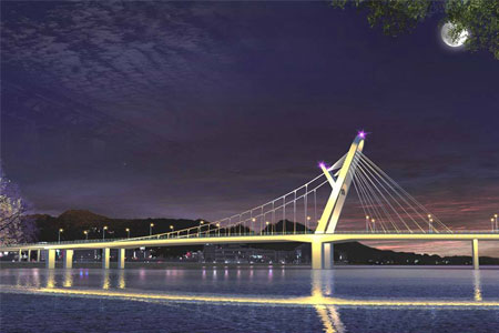 南平跨江大桥为自锚式独塔悬索-斜拉协作体系桥,主线桥梁全长449米,包括4...