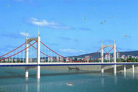 临汾洰河桥为主跨168+168米的自锚式悬索桥。...